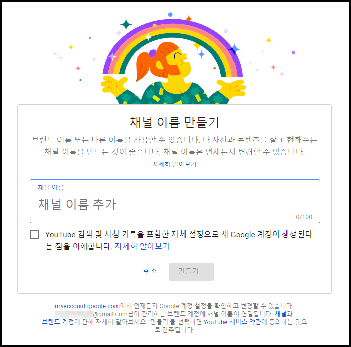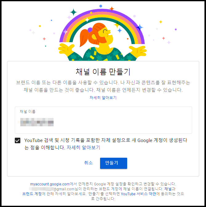 3. '채널 이름 만들기'에서 채널이름을 입력해 줍니다. 채널 이름은 언제든지 변경할 수 있습니다. 박스에 체크를 하고 '만들기'를 눌러줍니다.