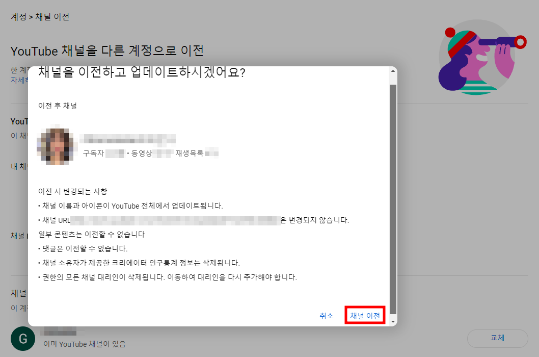 내용을 확인해 보면 채널 이름과 아이콘이 업데이트되고, 채널 URL은 변경되지 않고 일부 콘텐츠는 이전되지 않으며 채널 소유자가 제공한 크리에이터 인구통계 정보는 삭제되고, 권한의 모든 대리인이 삭제된다고 알려줍니다.