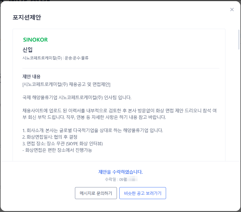 남편이 사람인 사이트에 이력서를 올려놓았는데 시노코페트로 케미컬이라는 회사로부터 면접 제안이 왔습니다.