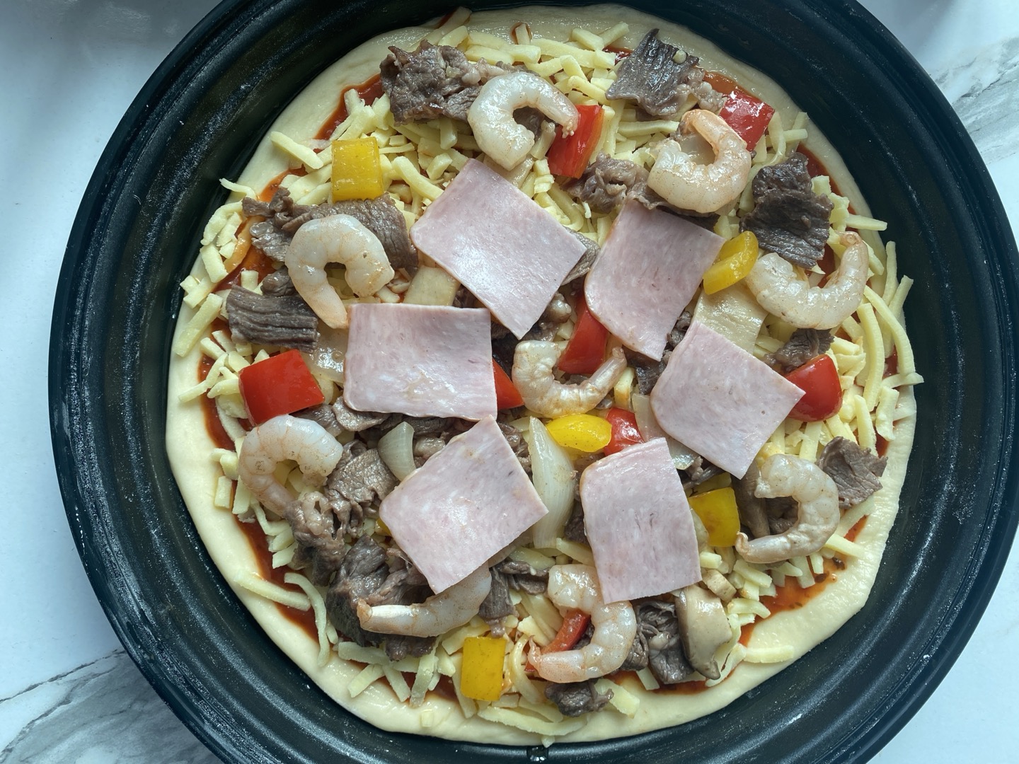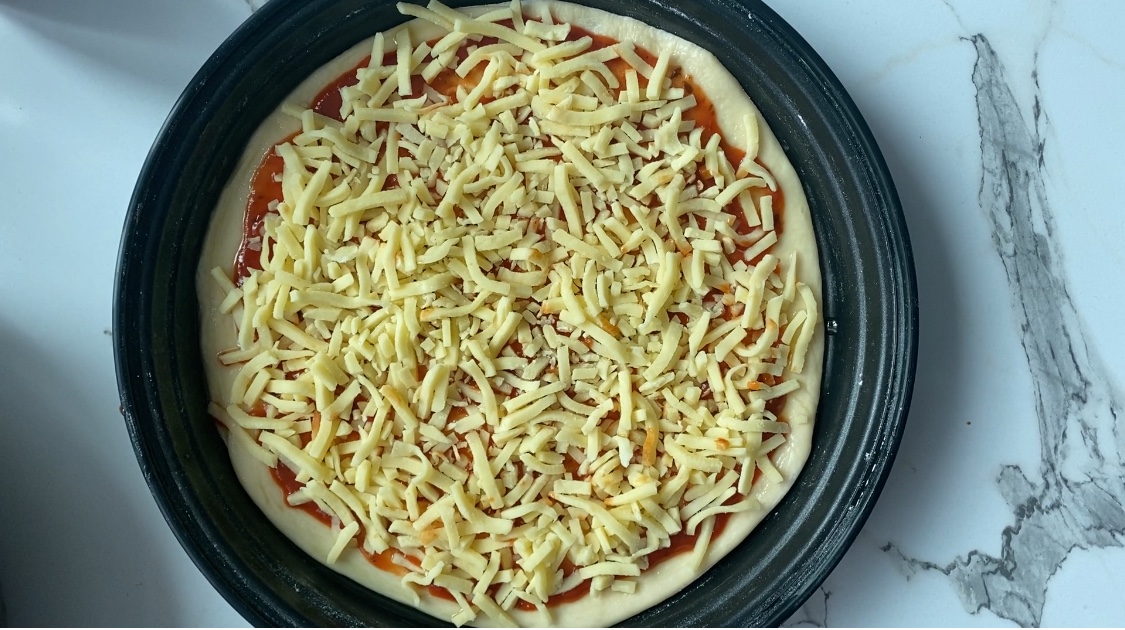 모짜렐라 치즈를 뿌리고 토핑을 한다.
