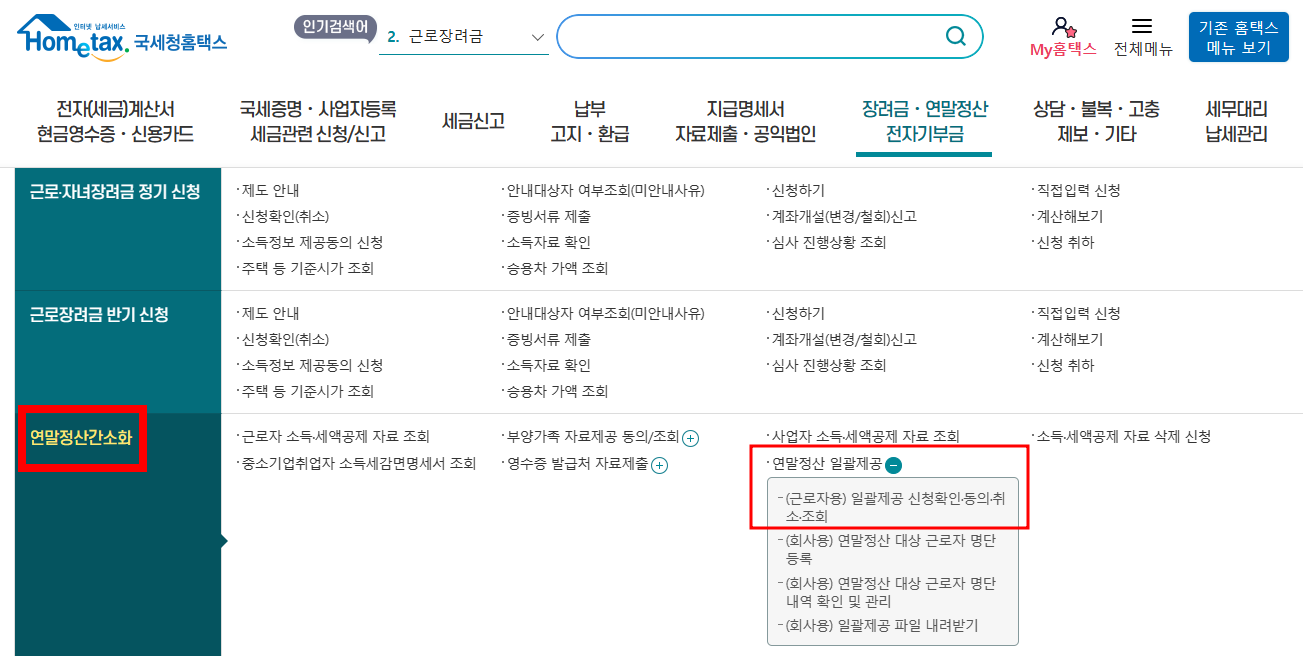 1. 국세청 홈택스에서 상단의 장려금, 연말정산 전자기부금 > 연말정산 간소화> 연말정산 일괄제공 > (근로자용) 일괄제공 신청 확인, 동의, 취소, 조회 순으로 클릭해 줍니다.
