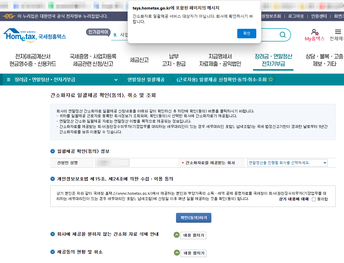 3. 간소화자료를 제공할 회사를 선택 > 개인정보 수집, 이용 '동의함'을 선택 > '확인(동의)하기' 선택하여 완료합니다. 저는 로그인 후 '간소화 자료 일괄제공 서비스 대상자가 아닙니다. 회사에 확인하시기 바랍니다.'라고 팝업이 떴습니다 ㅠ