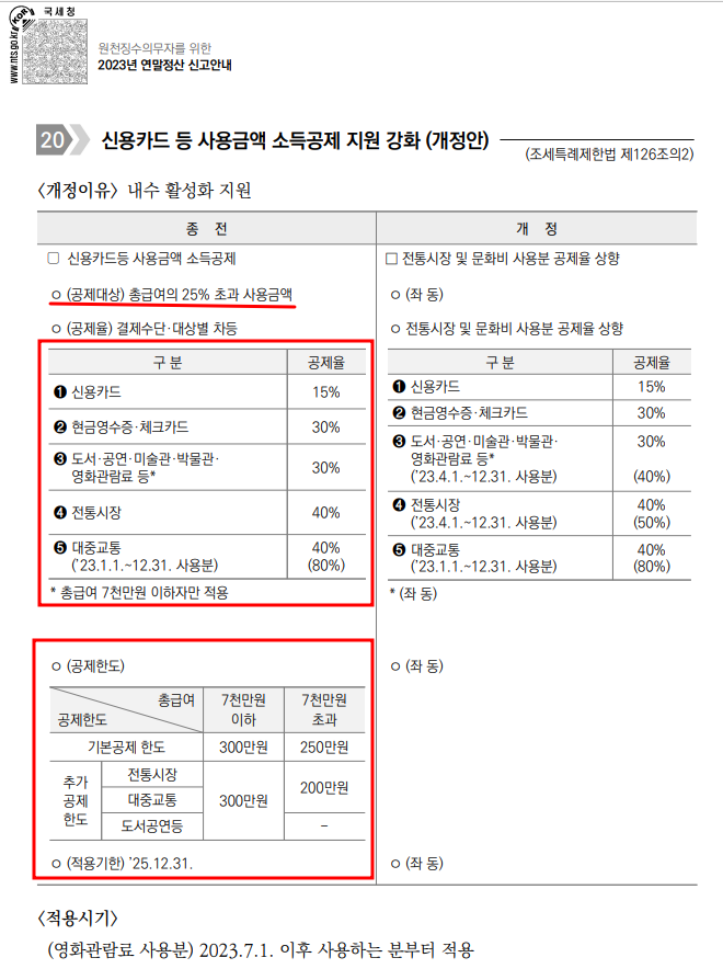 전통시장 및 문화비 사용분 공제율 상향. 영화관람료 사용분 2023.7.1. 이후 사용하는 분부터 적용.
