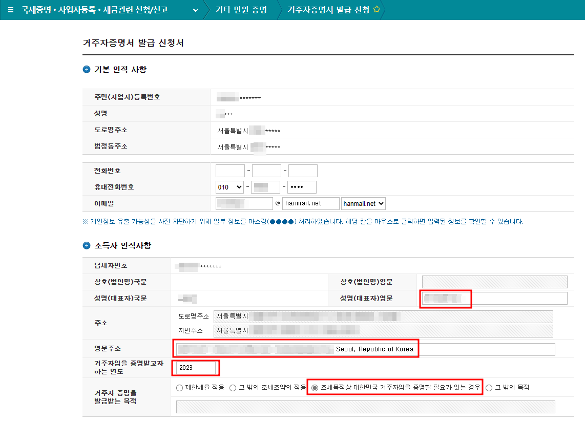 이후 다시 '거주자증명서 발급 신청'을 클릭하면 '거주자증명서 발급 신청서' 페이지가 나옴. 빨간색으로 체크된 부분들을 입력해 주기.