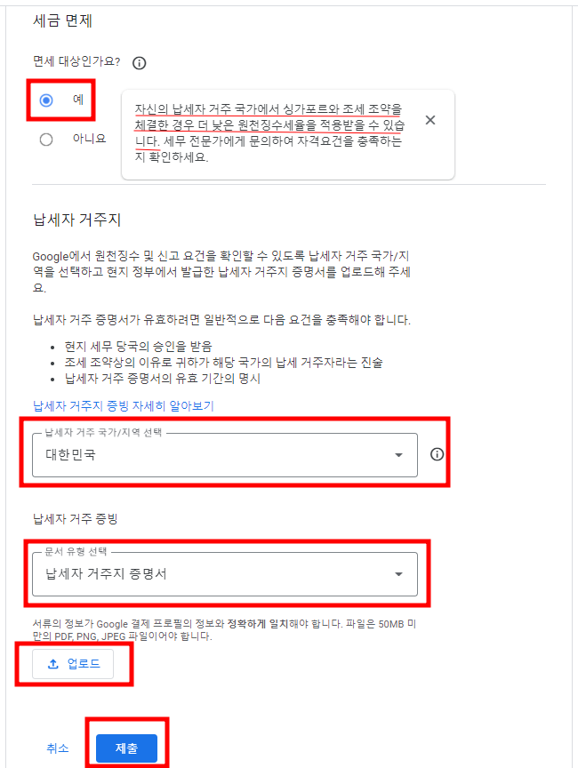 세금 면세 대상에 '아니요'라고 체크 시 따로 서류 첨부할 필요 없음. 납세자 거주 증빙 문서 유형은 '납세자 거주지 증명서'로 체크하고 하단에 '업로드'버튼을 클릭하여 미리 준비해 둔 '거주자 증명서' 파일을 첨부.