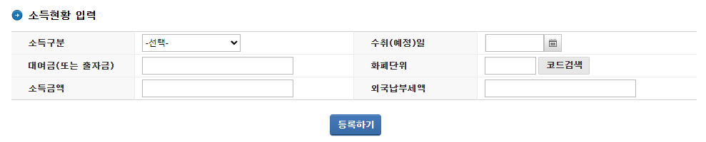 '소득현황입력' 부분은 필수 항목이 아니므로 입력하지 않아도 됨. '등록하기' 버튼도 누르지 않고 넘어가기.