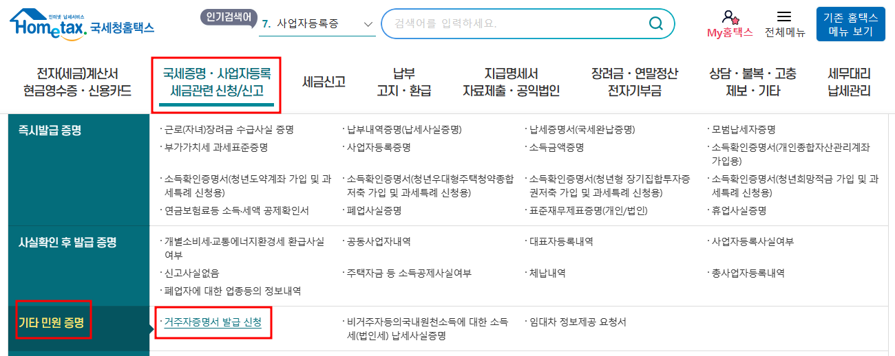 국세청 홈택스 홈페이지 접속 및 로그인 > 상단에 국세증명, 사업자등록 세금 관련 신청/신고에 마우스를 대고 > 왼쪽 기타 민원 증명에 있는 '거주자증명서 발급 신청'을 클릭 > 통합설치프로그램 다운로드 안내가 나오면 진행해 주기