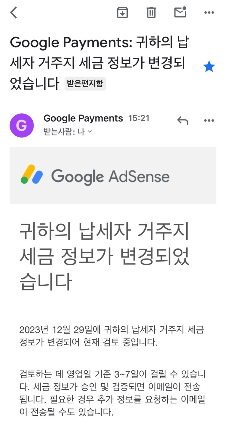 11월 3일(일)에 google payments로부터 메일을 받았습니다. '납세자 거주지 세금정보가 2024년 12월에 만료됩니다'라는 제목으로 왔고 2024년 12월 31일까지 나의 납세자 거주지 세금 정보를 업데이트하라