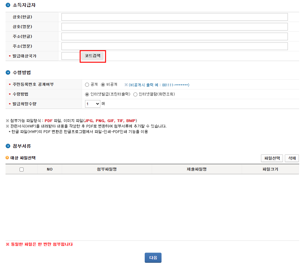'수령방법' 항목에서 주민등록 공개여부 선택(저는 공개로 선택함), 수령방법(저는 인터넷 발급으로 선택함) 후 하단에 '다음' 클릭.