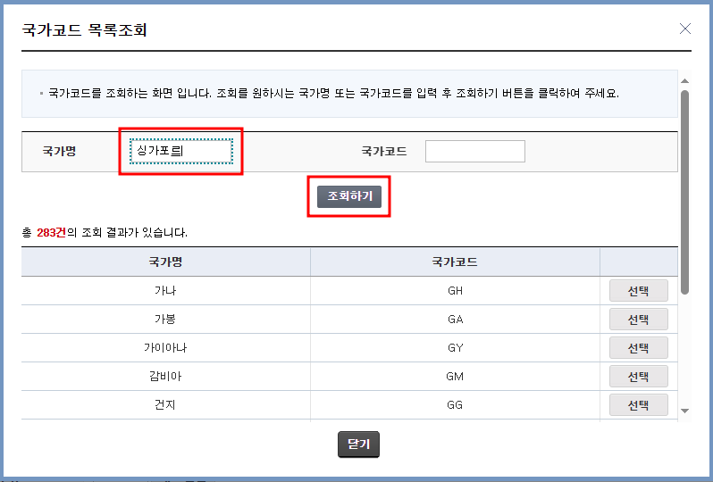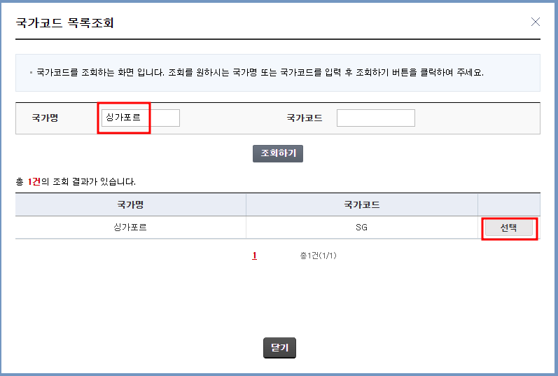 '소득지급자' 항목에서 빨간색으로 필수 표시가 되어있는 발급대상국가만 입력해 주면 됨. 코드검색 클릭 > 국가명에 '싱가포르'라고 입력 > '조회하기' 클릭 > '선택' 클릭