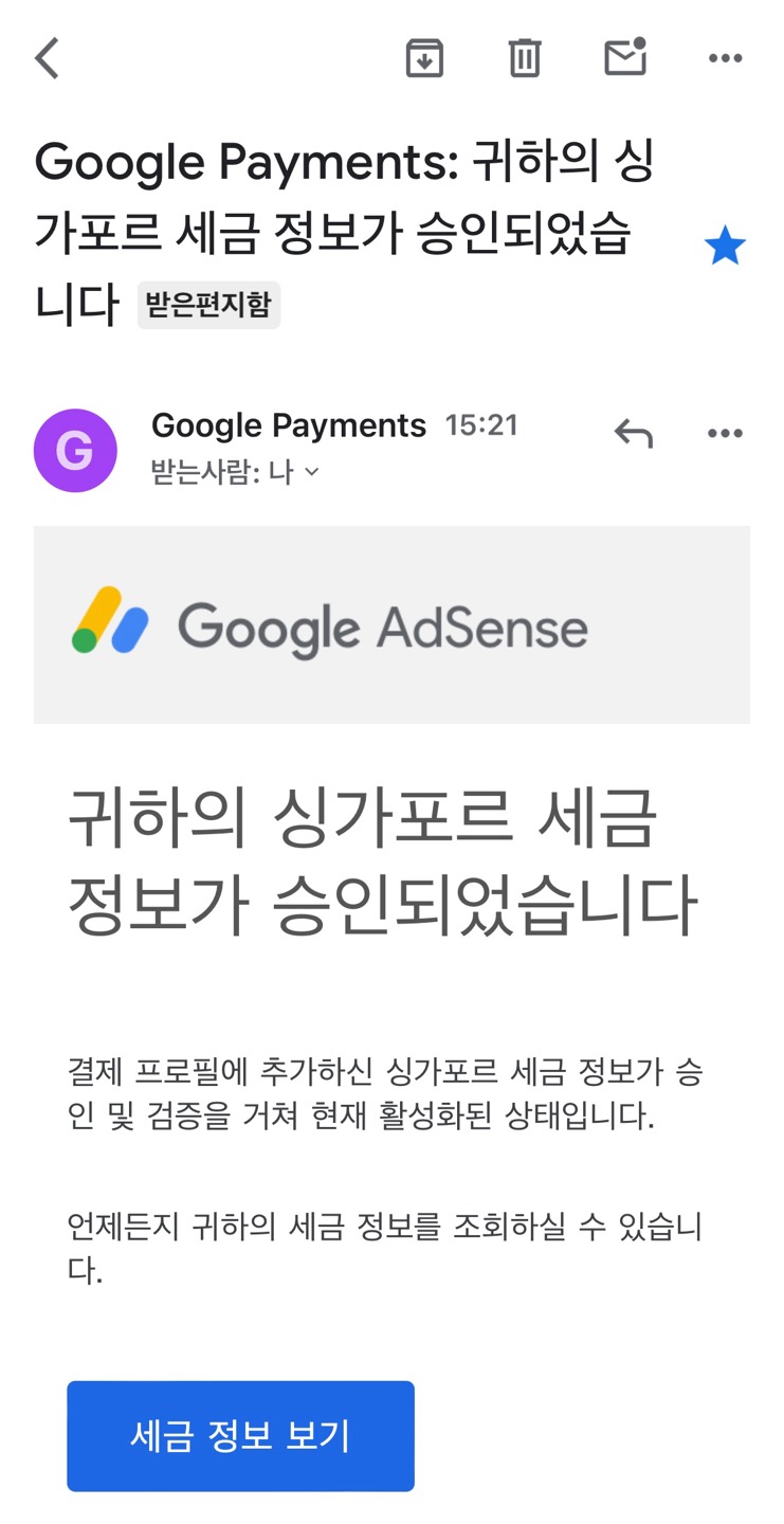 ⊙ 목차 - 2024 거주자 증명서 제출 방법 - 마무리 글 - 함께 보면 도움되는 글 안녕하세요~ 얼마 전 구글 애드센스 싱가포르 세금 정보와 미국 세금 정보를 제출했었는데요. 2주 후 구글 애드센스