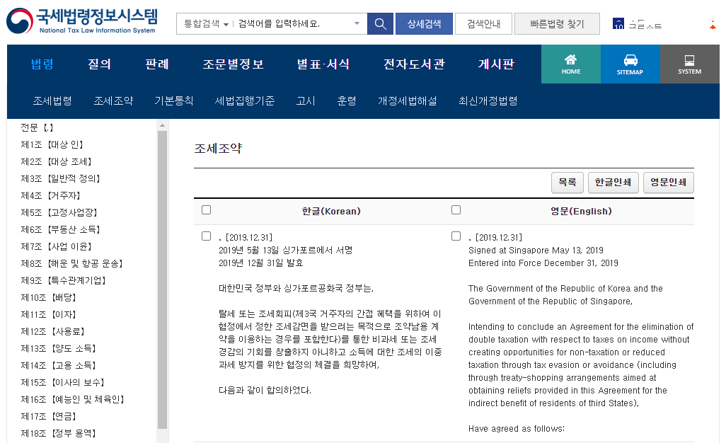 한국과 싱가포르는 아래와 같이 조세조약이 체결되었습니다.