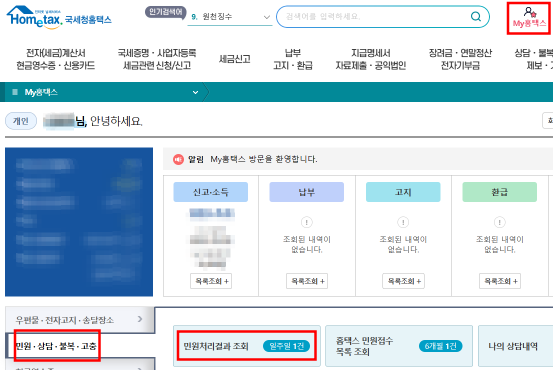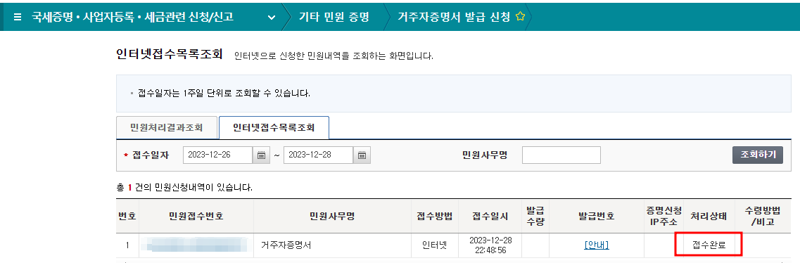 인터넷 접수목록조회 화면이 뜨고 처리상태가 접수완료 확인 가능.