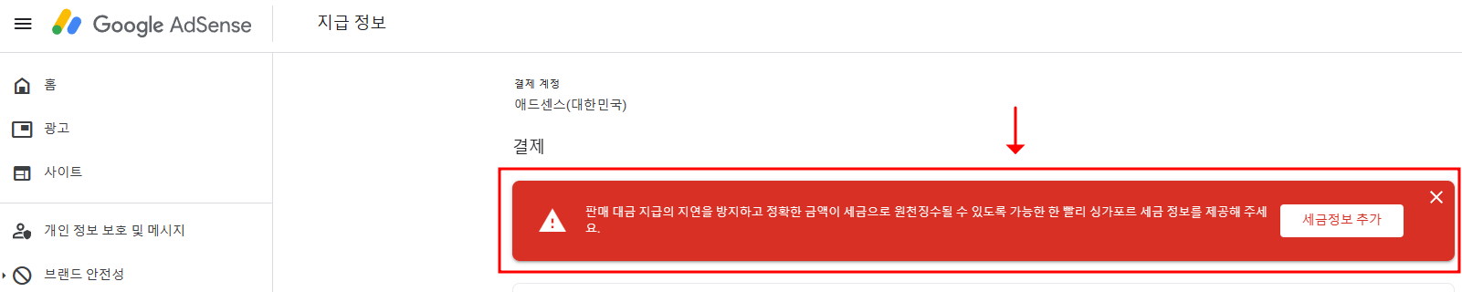 구글애드센스 웹사이트에 아래와 같이 빨간 창이 뜬 것을 보고 이건 또 뭐지 하고 정보를 찾아보았는데요.