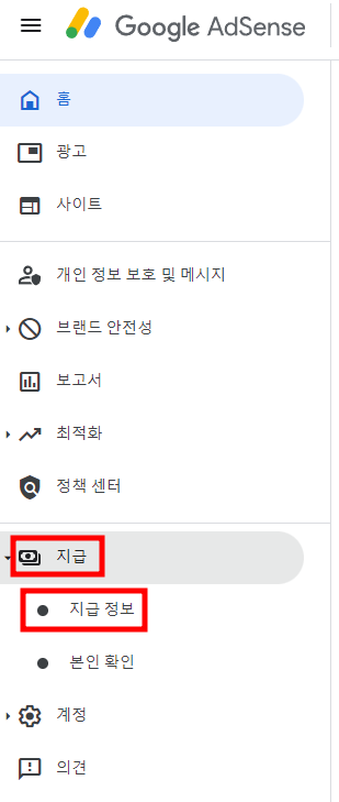 애드센스 계정에서 왼쪽 '지급' 클릭> '지급 정보' 클릭