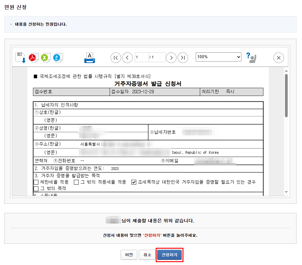 위와 같이 '거주자증명서 발급 신청서'가 뜨면 내용이 맞는지 확인 후 하단에 '신청하기' 클릭.