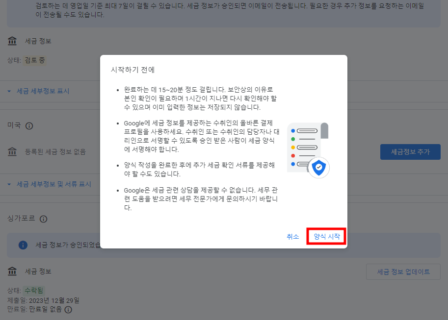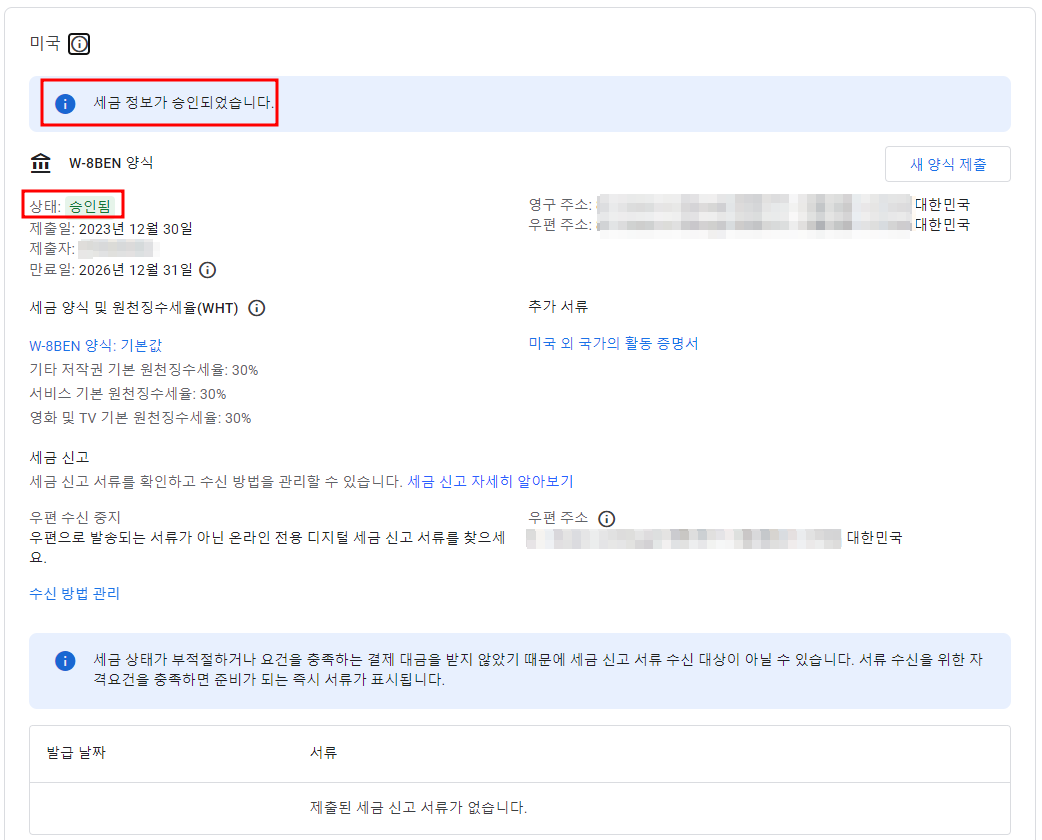 다음 화면에서 세금 정보가 승인되었다는 내용을 확인할 수 있고 바로 세금 정보 승인 메일도 옴.