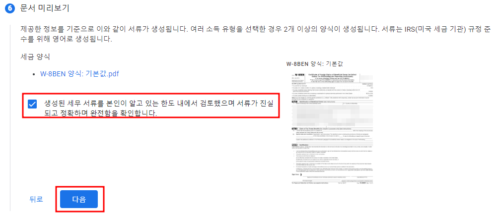 내용이 정확한지 확인 후 '생성된 세무 서류를 본인이 알고 있는 한도 내에서 검토했으며 서류가 진실되고 정확하며 완전함을 확인합니다' 왼쪽 박스에 체크.
