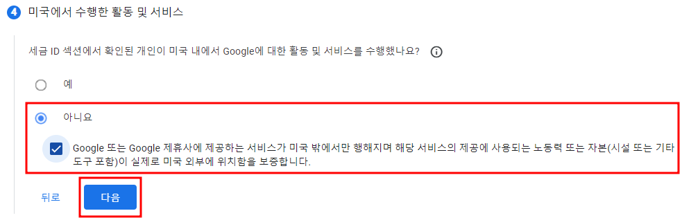 '미국에서 수행한 활동 및 서비스' 는 '아니요'와 하단에 박스 체크하고 '다음 ' 클릭