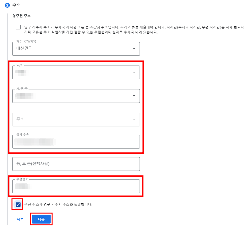 '우편 주소가 영구 거주지 주소와 동일합니다' 왼쪽 박스에 체크 후 하단에 '다음' 클릭.