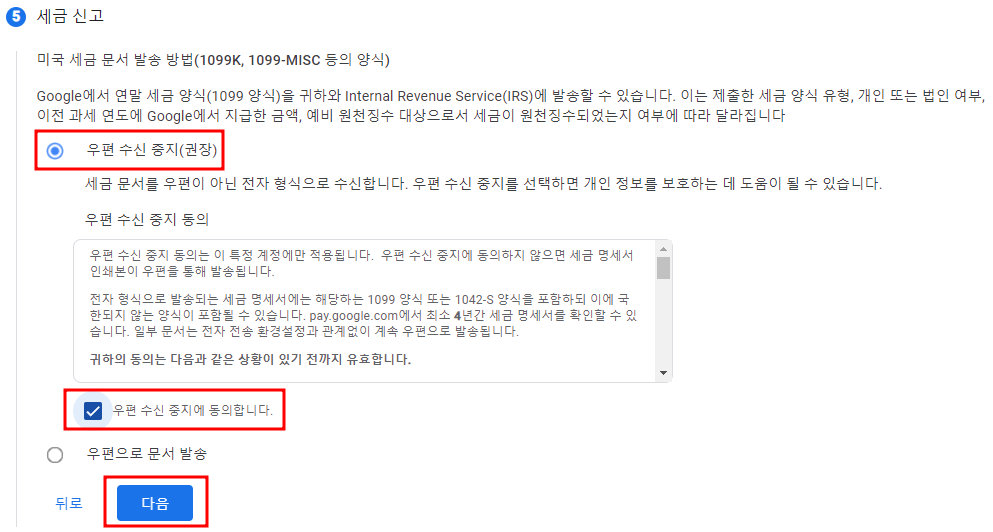 미국 세금 문서 발송을 우편으로 받을 건지 전자형식(이메일)으로 받을 건지 선택하는 것.