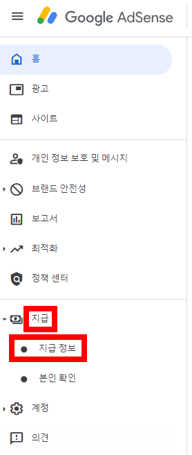구글 애드센스 홈페이지에서 왼쪽 '지급' 클릭> '지급정보' 클릭