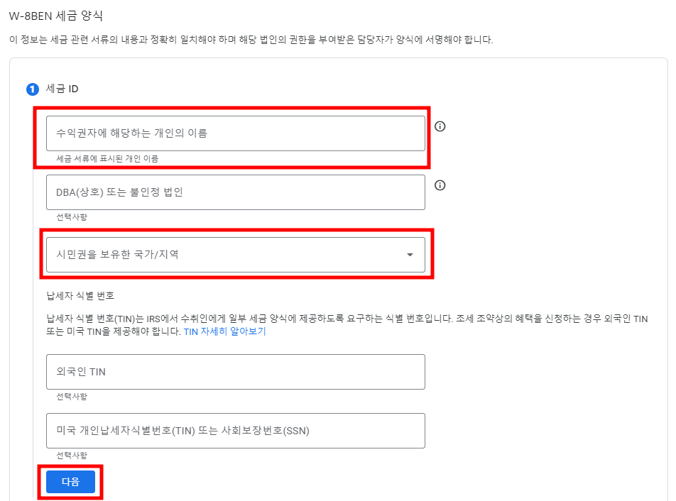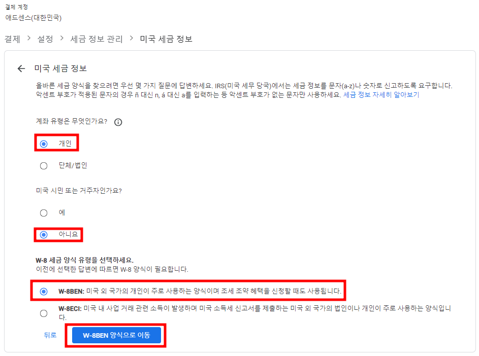 해당되는 내용을 클릭 후 하단에 'W-8BEN 양식으로 이동' 클릭.