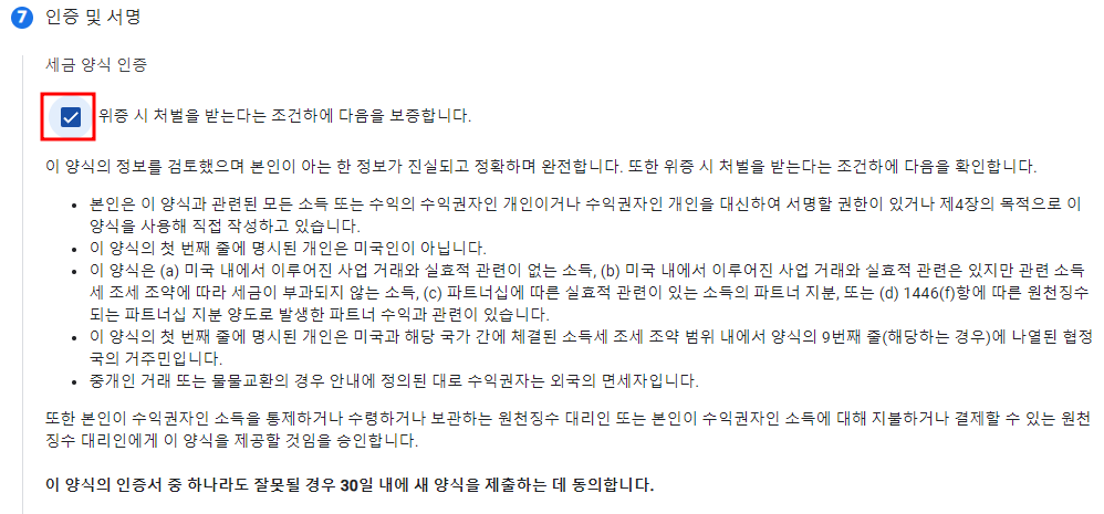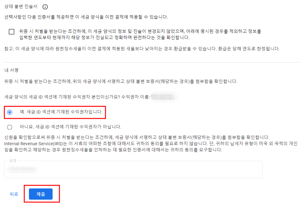 '내 서명'에서 '예. 세금 ID 섹션에 기재된 수익권자입니다.'에 체크하고 하단에 '제출' 클릭.