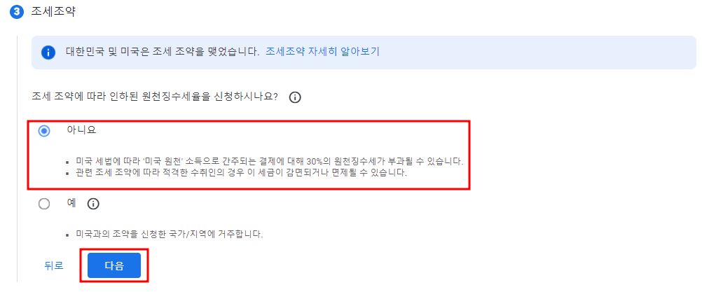 조세조약에 따라 인하된 원천징수세율 신청은 '아니요' 클릭.