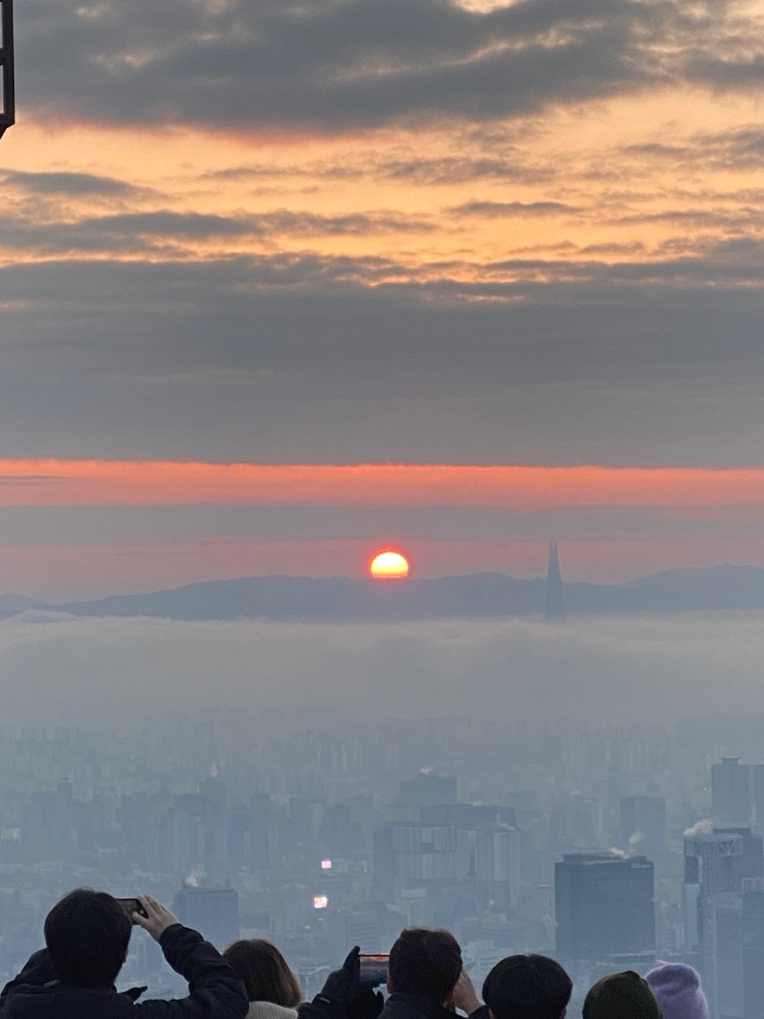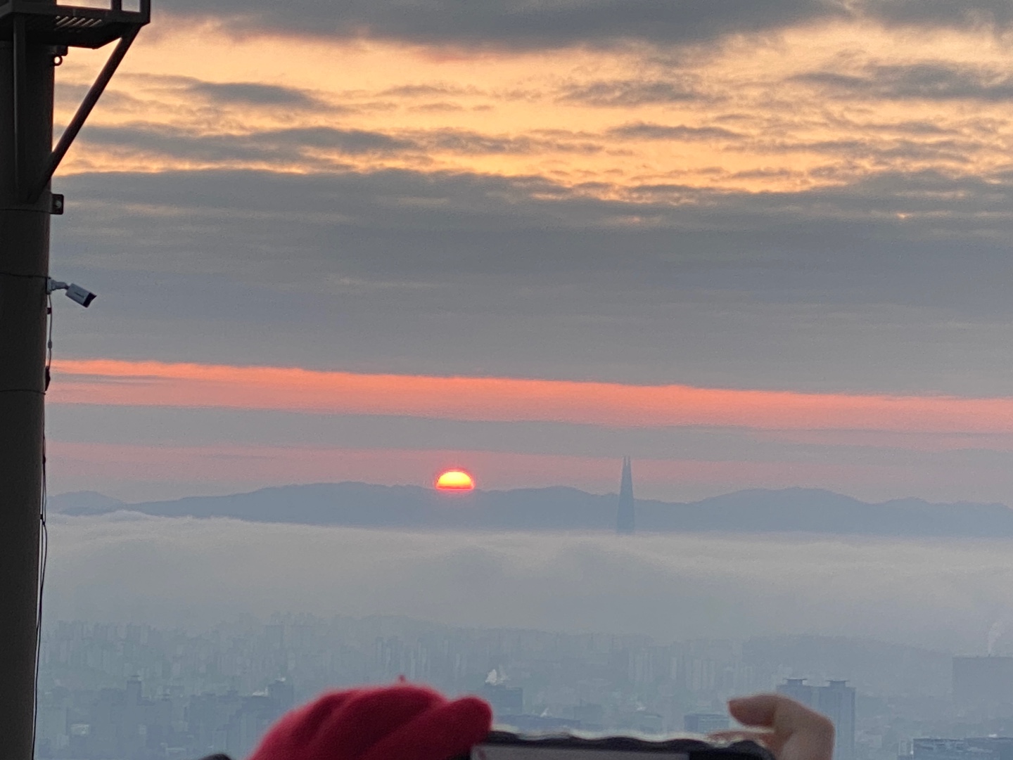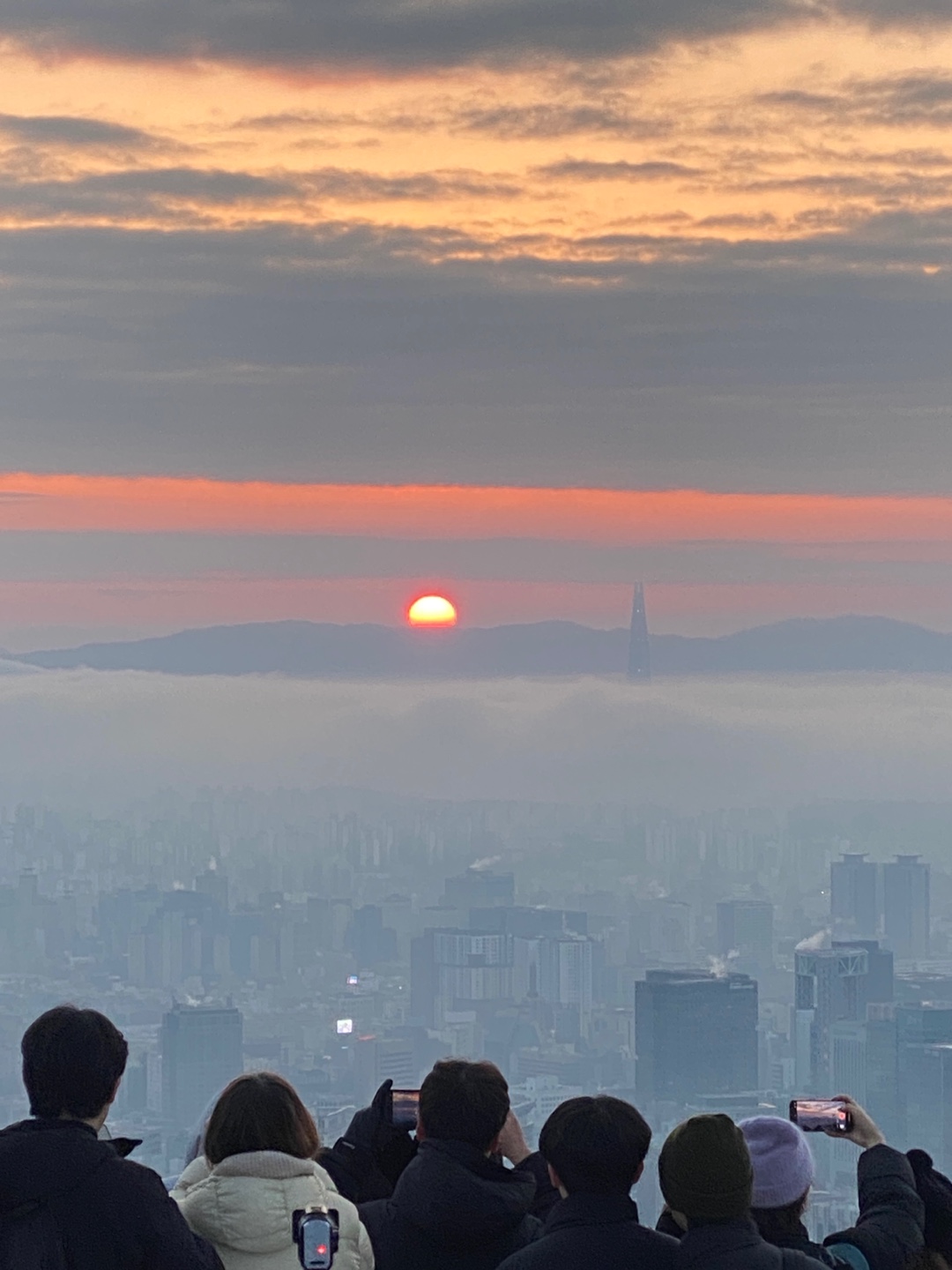 인왕산 도착 후 약 1시간 가량 가만히 앉아서 일출을 기다리다 보니 춥고 발바닥이 시리더라고요. 다행히 보온병에 싸간 커피가 있어서 마시니 한결 나았습니다. 정확히 오전 7시49분에 해가 빼꼼히 얼굴을 드러내기 시작했어요!! 그러더니 뿅 하고 떴는데 너무나도 신기했습니다 ㅎㅎ