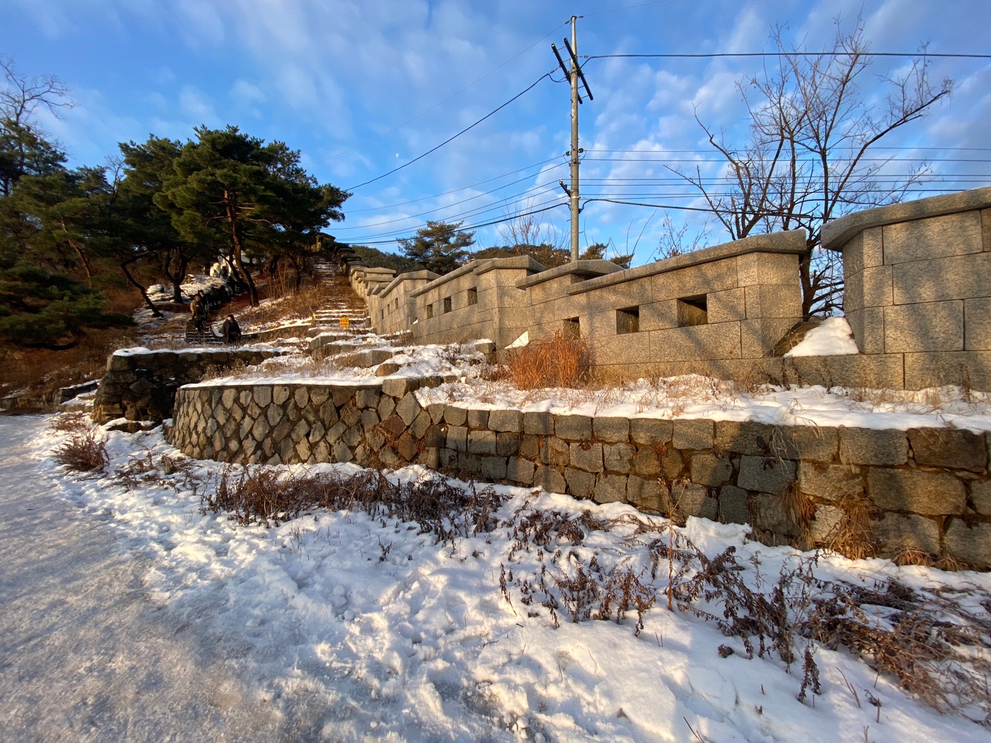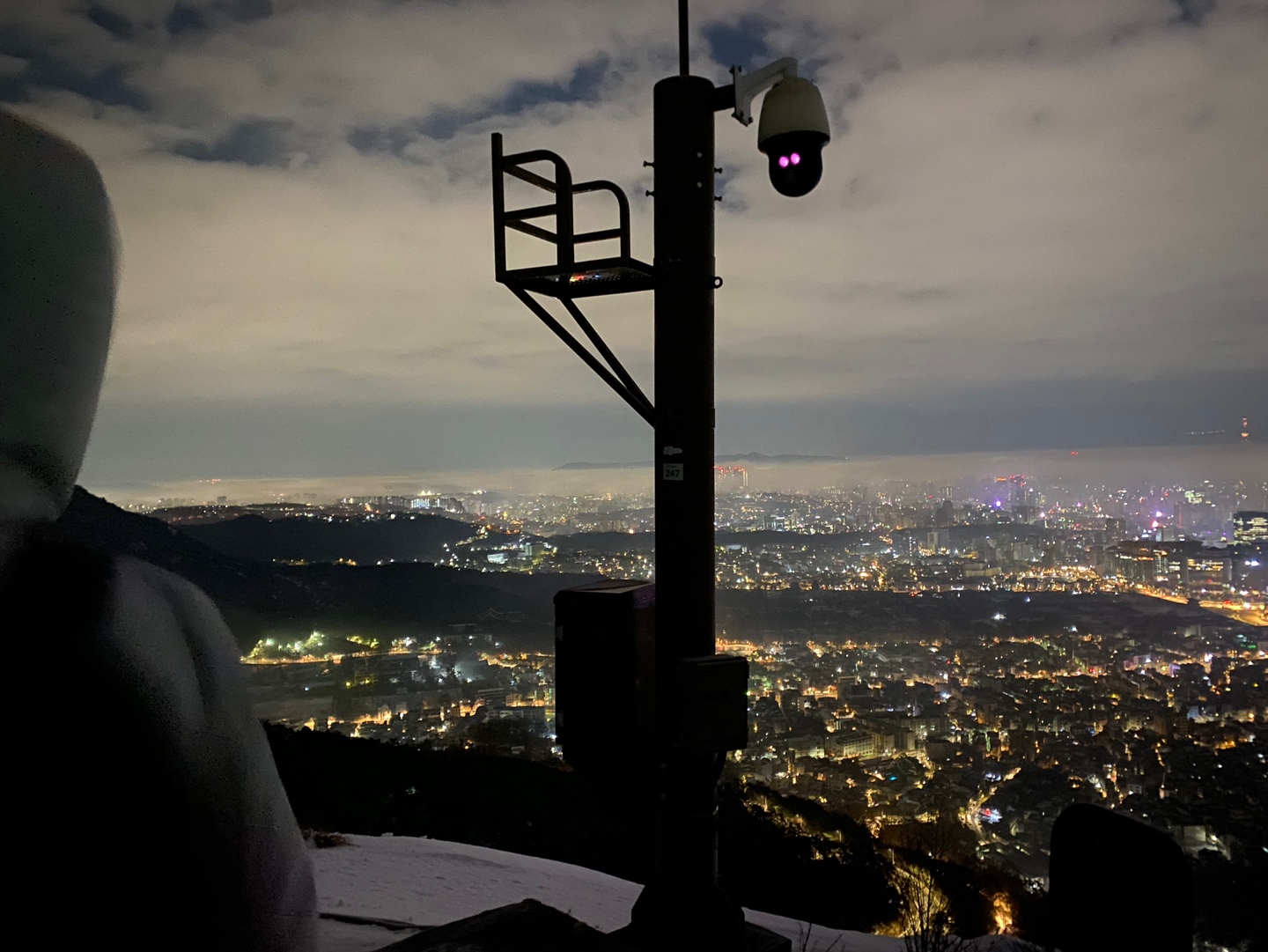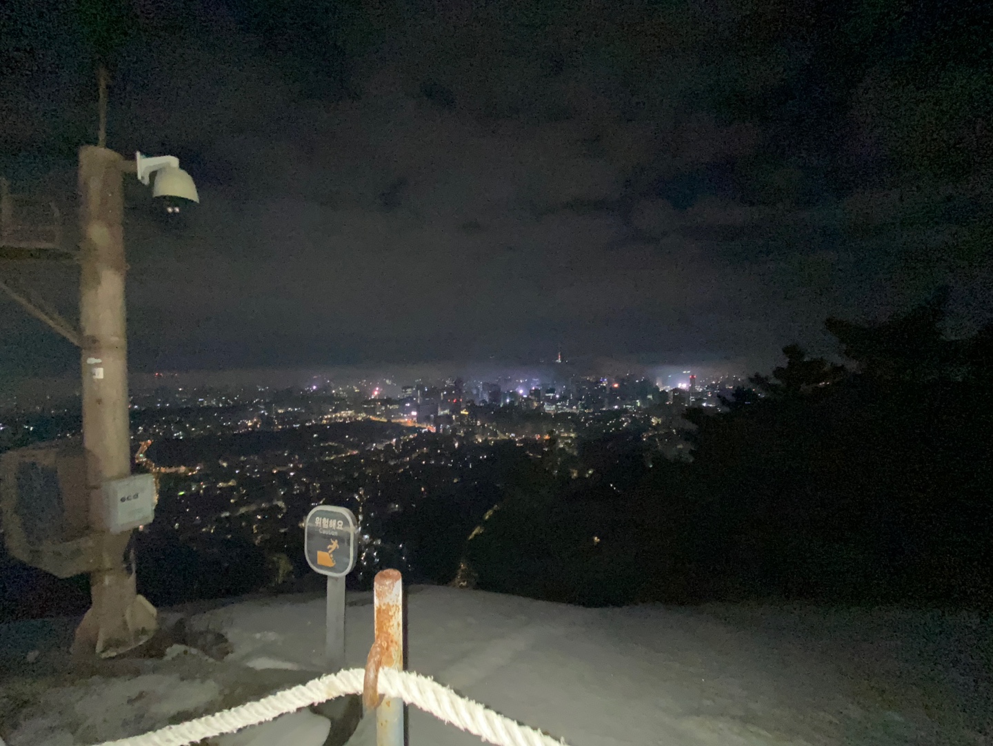 많이 어둡고 밧줄 뒤로는 낭떠러지인 거 같았는데 내린 눈으로 인해 바닥은 얼고 미끄러워서 너무 무서웠어요 ㅠㅠ 아무런 생각 없이 제대로 된 준비도 없이 옷만 따뜻하게 입고 온 나.. 생각 없이 용감 무식하게 왔습니다 ㅠㅠ 다음에 등산을 올 때는 꼭 등산화, 랜턴(어두울 때 등산하는 경우), 등산용 장갑은 구비해야 할 거 같아요. 다른 등산하시는 분들 보니 헤드랜턴이 편리하고 좋아 보이더라고요. 그리고 너무 추운데 장갑도 없이 맨손으로 갔다가 은인(?)을 만나서 잠깐 같이 등산하는 동안 여분 장갑을 빌려주셨답니다. 장갑을 끼니 밧줄 잡고 등산하는데 너무나 도움이 되었어요. 운동화도 미끄러지기 쉽기 때문에 등산화를 신는 것을 권장드려요.