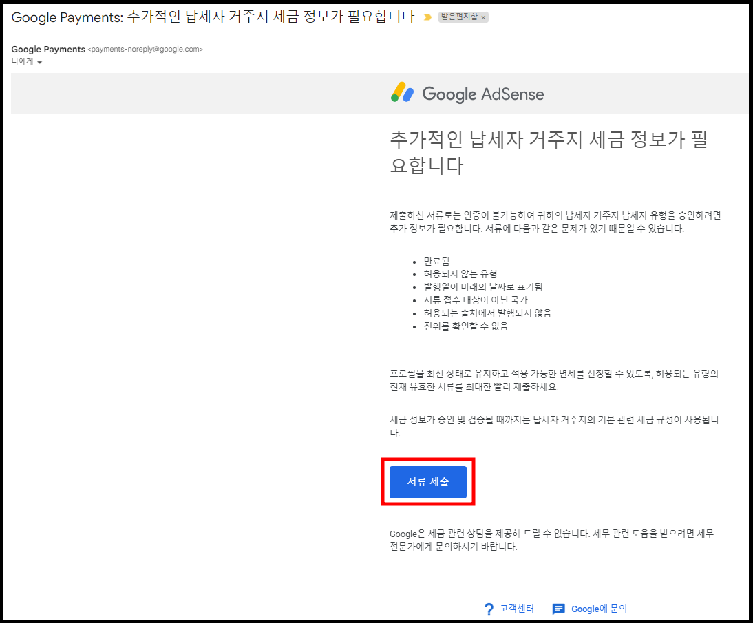 아래와 같이 구글 애드센스로부터 받은 메일은 제출한 서류로는 인증이 불가하여 납세자 거주지 납세자 유형을 승인하려면 추가 정보가 필요하다는 내용이었는데요.
