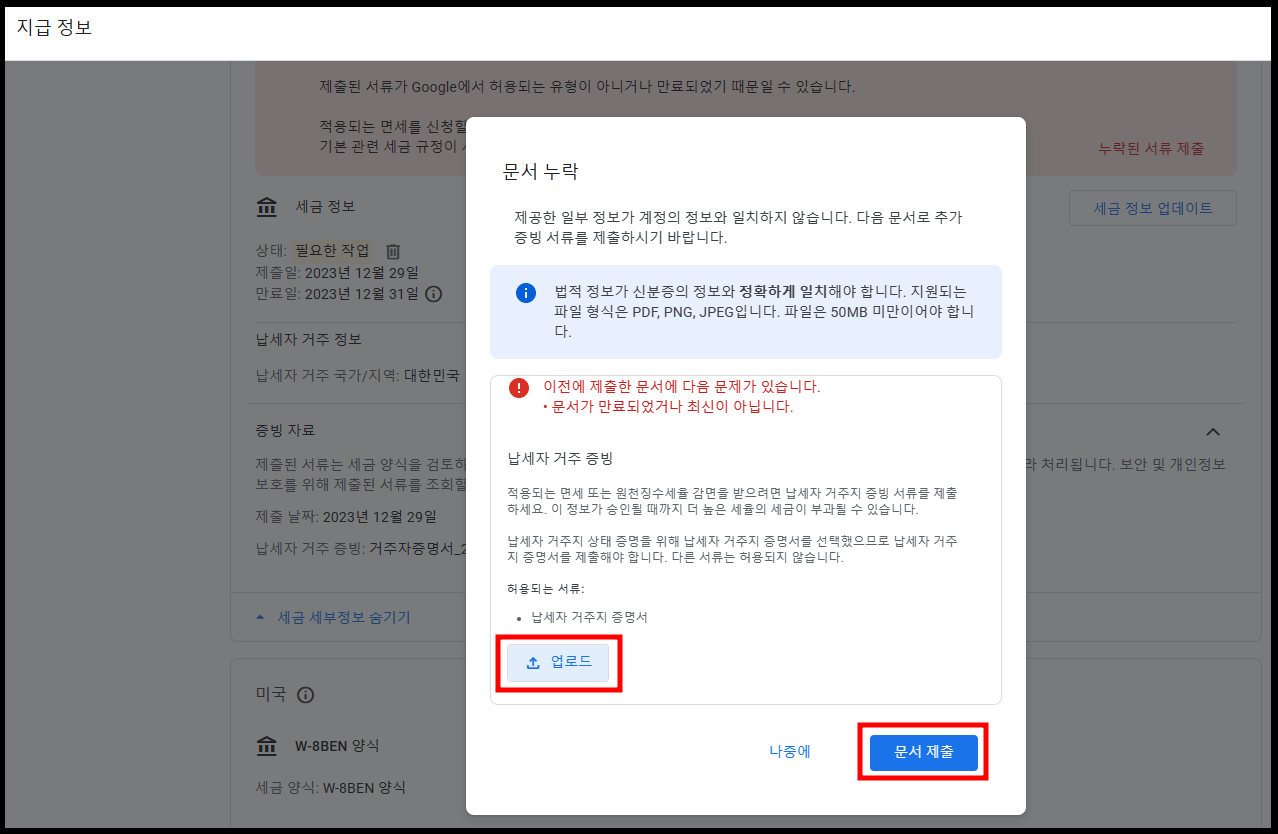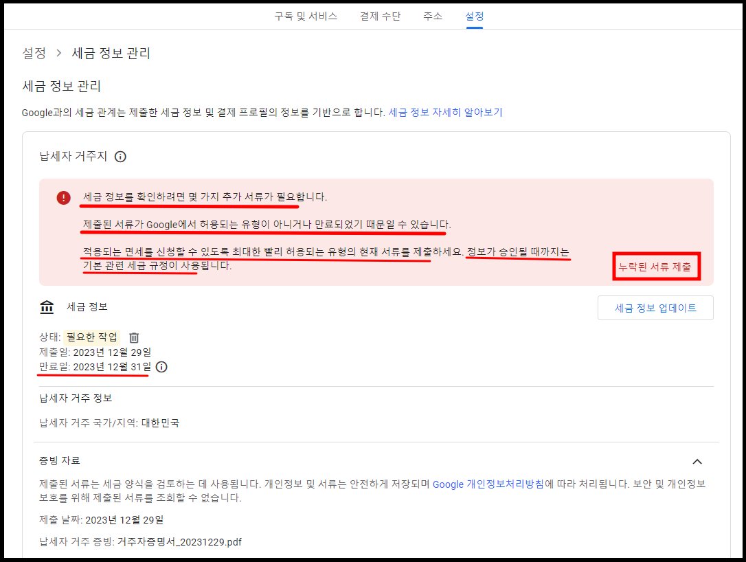 메일 하단에 '서류 제출'을 클릭하면 아래와 같이 구글 애드센스 사이트 화면으로 연동되는데 '누락된 서류 제출'을 클릭하여 세금정보를 업데이트해 주면 됩니다.