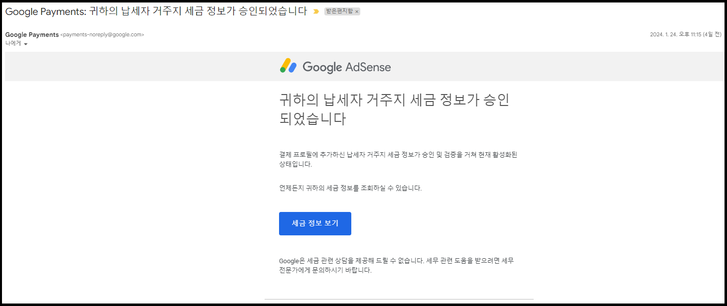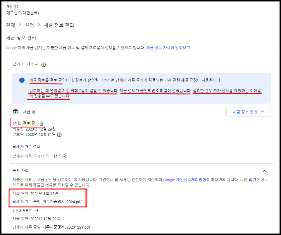 세금 정보가 승인되면 이메일이 전송되며 필요한 경우 추가 정보를 요청하는 이메일이 전송될 수도 있다고 합니다.