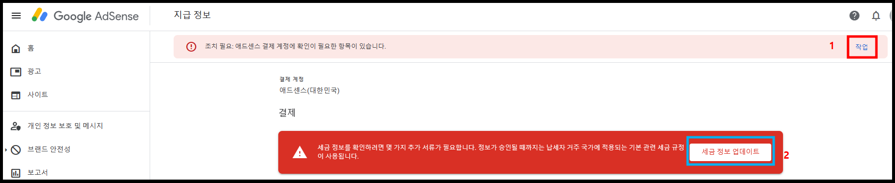 얼마 전 티스토리 구글애드센스 웹사이트에 접속해서 '지급정보'를 눌렀는데 아래와 같이 빨간 창이 뜬 것을 보게 되었습니다. 이건 또 뭐지 하고 정보를 찾아보았는데요. 세금 정보 제출 양식