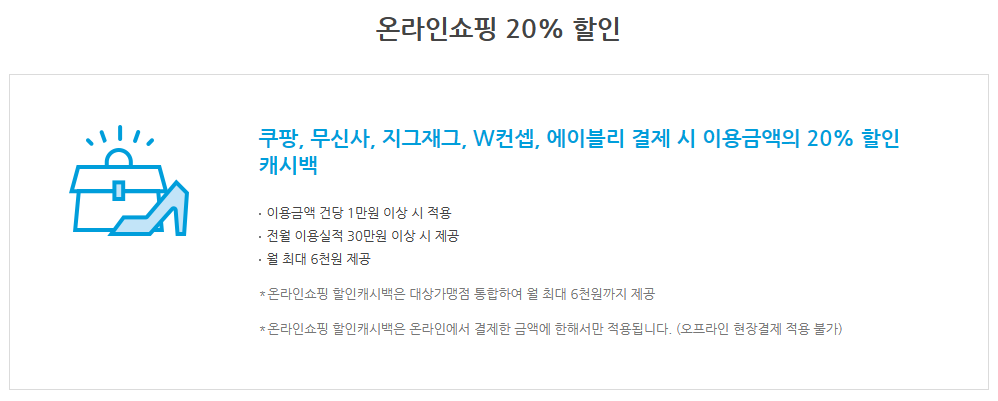 온라인 쇼핑의 경우 쿠팡, 무신사, 지그재그, W컨셉, 에이블리 결제 시 이용금액의 20% 할인 캐시백을 제공받습니다. 간편 결제와 동일하게 이용금액 건당 1만 원 이상시 적용이 됩니다. 온라인 쇼핑 할인캐시백은 온라인에서 결제한 금액에 한해서만 적용이 되며 오프라인 현장결제 적용은 불가합니다.