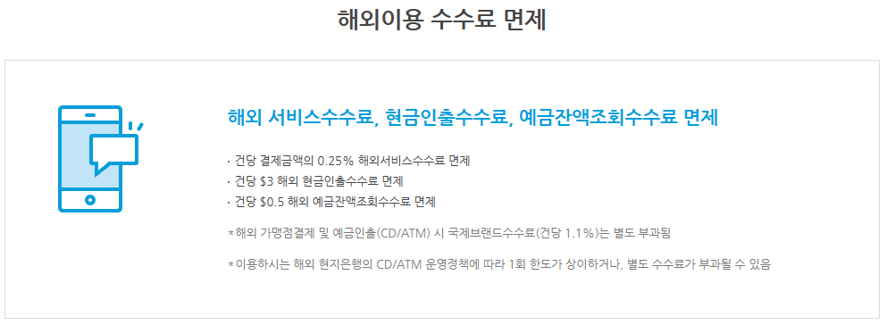 그 외에도 해외 서비스 수수료, 현금인출 수수료, 예금 잔액조회 수수료도 면제가 된다고 해요. 이 모든 혜택은 전월 이용실적(상품권 등) 30만원 이상시 제공됩니다.
