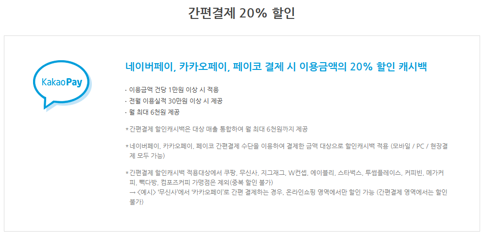 간편 결제(오프라인에서도 사용 가능)의 경우 네이버페이, 카카오페이, 페이코 결제 시 이용금액의 20% 할인 캐시백이 제공되고 이용금액 건당 1만 원 이상시 적용이 되므로 참고해 주세요.