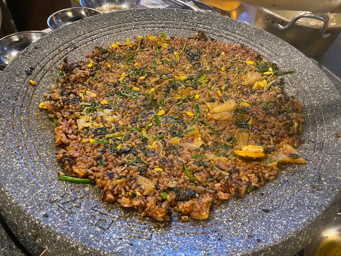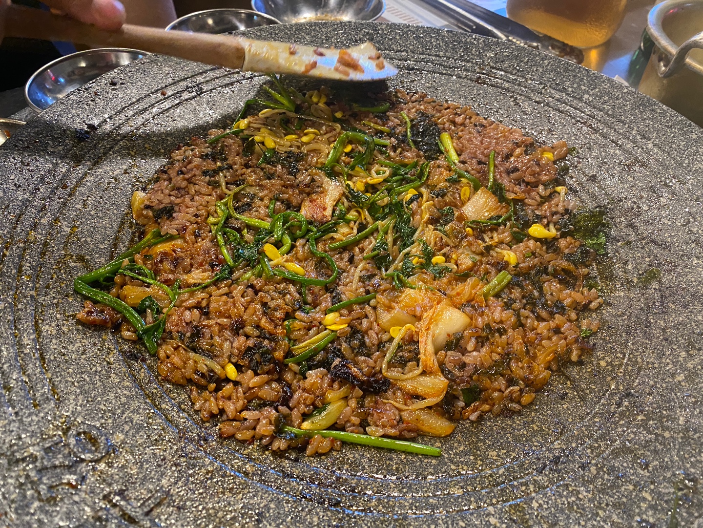 직원분이 돌뚜껑에 마늘, 콩나물무침, 묵은지, 미나리도 넣고 볶아주셨었는데 이날 제가 너무도 좋아하는 사람들과 또 맛있는 음식을 먹다보니 기분도 좋고 술이 술술 들어가서 사진이 많이 없네요 ㅋㅋ 누룽지도 주문해서 먹었는데 고소하고 맛있었어요.