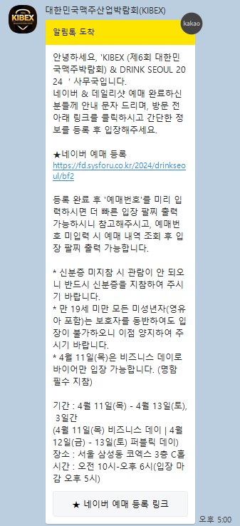 저의경우 얼리버드로 티켓을 사전 예매했었고 지난 4월 9일 화요일에 아래와 같이 카톡 메시지를 받았는데요. 방문하는 당일에 현장에서 네이버 예매 등록 링크를 클릭해서 사전 등록( 예매번호 입력이 필요하니 미리 확인해 주세요.) 후 큐알코드를 스캔하신 뒤 입장 팔찌를 받아 입장하면 됩니다.