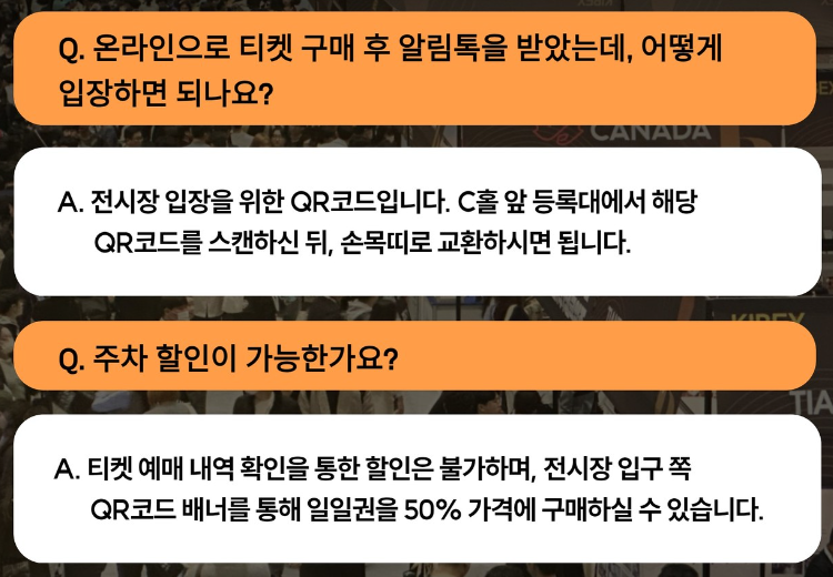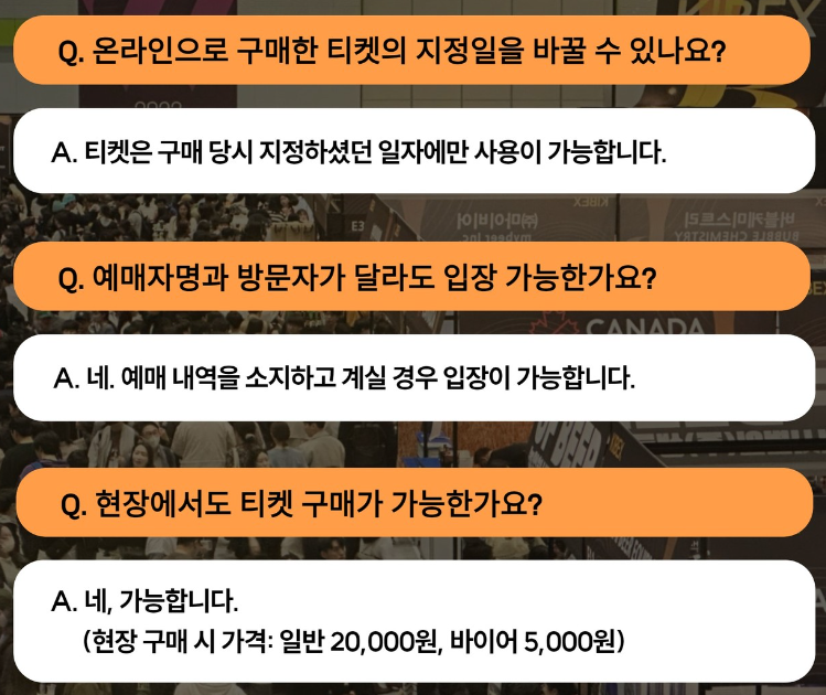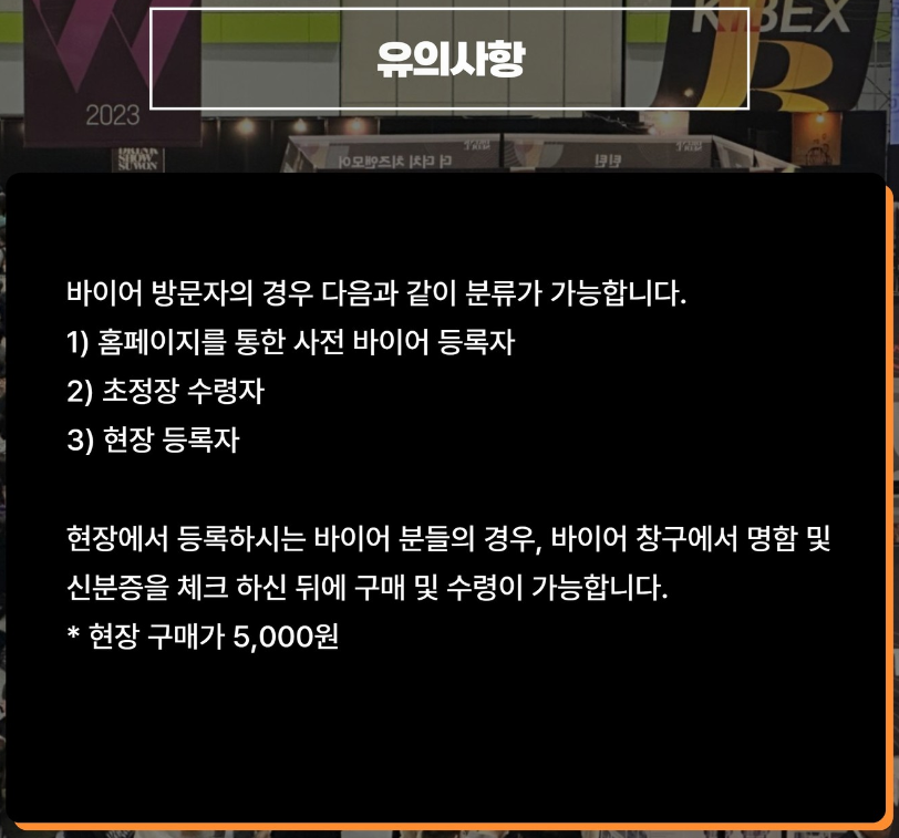 네이버 & 데일리샷 예매 완료하신 분들의 경우 2024.4.9(화)에 받은 카카오톡 메시지에서 네이버 예매등록 후 입장 팔찌를 받아 입장을 하면 되고 당일 현장에 가셔서 티켓을 구매 시 바이어는 5,000원 일반 참관객은 20,000원입니다.