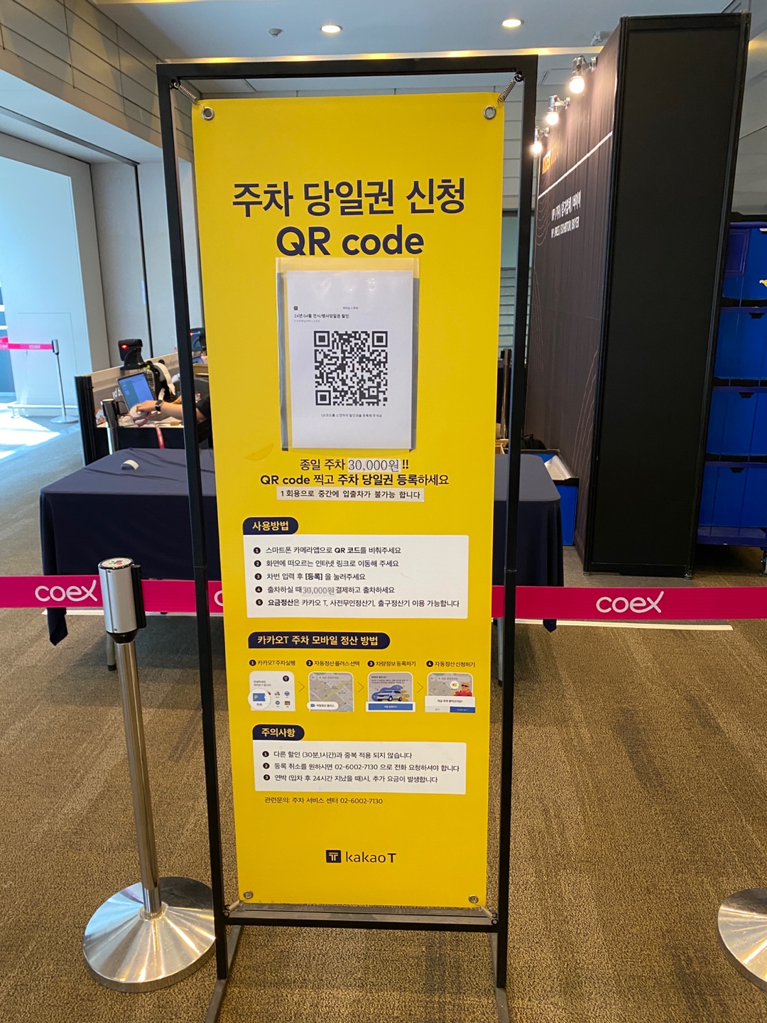 현장에서 큐알 코드를 찍고 주차 당일권 등록을 하시면 종일 주차가 30,000원이라고 해요. 이는 1회용으로 중간에 입출차는 불가능하다고 합니다. 사용방법과 카카오 T 주차 모바일 정산방법은 아래 사진을 참고해 주세요.