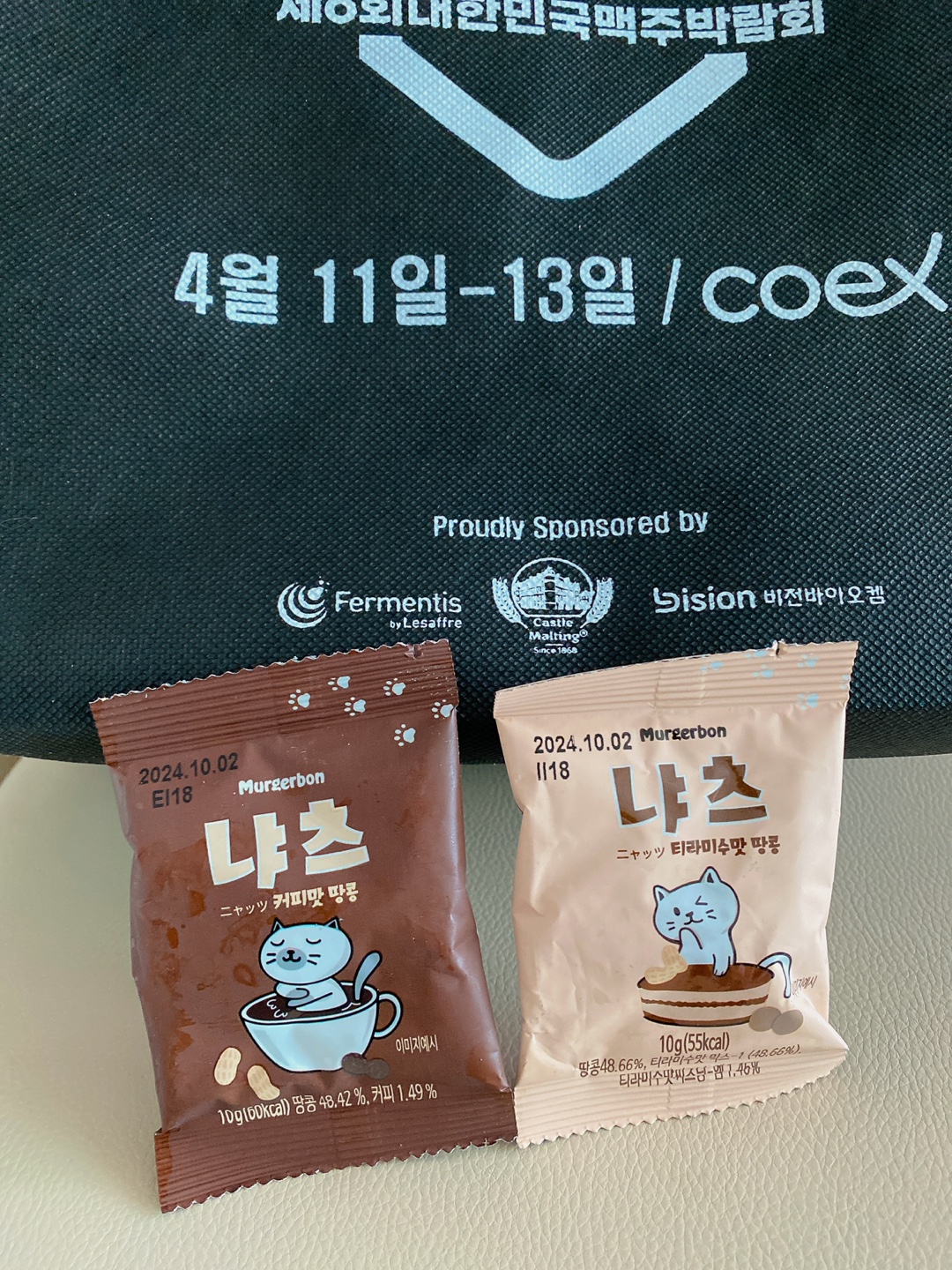 전시장 내 캐리어 및 카트 반입은 금지라고 해요. 전시장을 돌며 주류 등을 구매 후 가져가기 편하도록 쇼핑백이나 에코백을 지참하시면 좋아요. 그런데 입장할 때 입구에서 개인별로 가방(귀여운 머거본 땅콩 포함)을 하나씩 제공해 주시긴 하므로 참고해 주세요.
