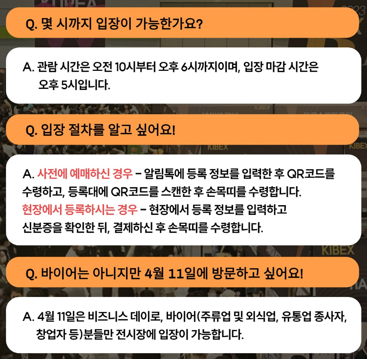 2024 KIBEX & DRINK SEOUL이 시작하는 첫날인 4월 11일(목)은 비즈니스 데이로, 바이어(주류업 및 외식업, 유통업 종사자, 창업자 등)분들만 전시장에 입장이 가능합니다.