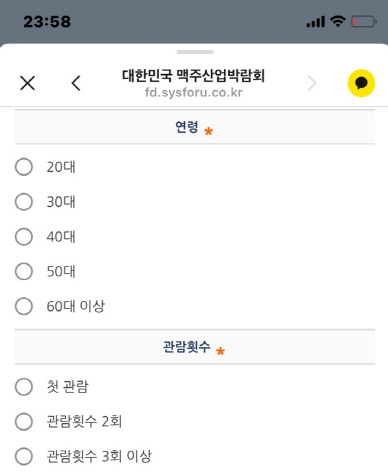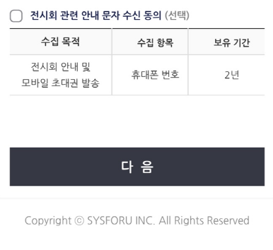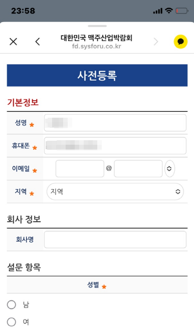 온라인 사전 등록은 아래와 같은 내용들을 입력해 주시고 '사전예매자 등록 완료' 화면에서 '네이버 예매 번호'를 입력 후 큐알코드를 스캔하고 입장 팔찌를 받아서 입장하였습니다.