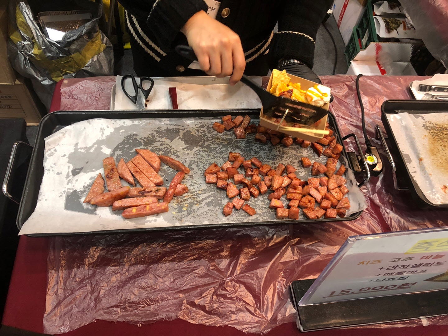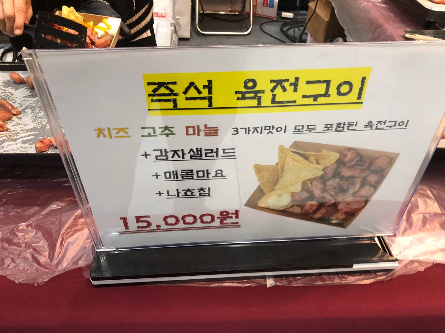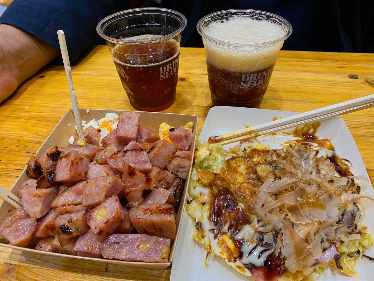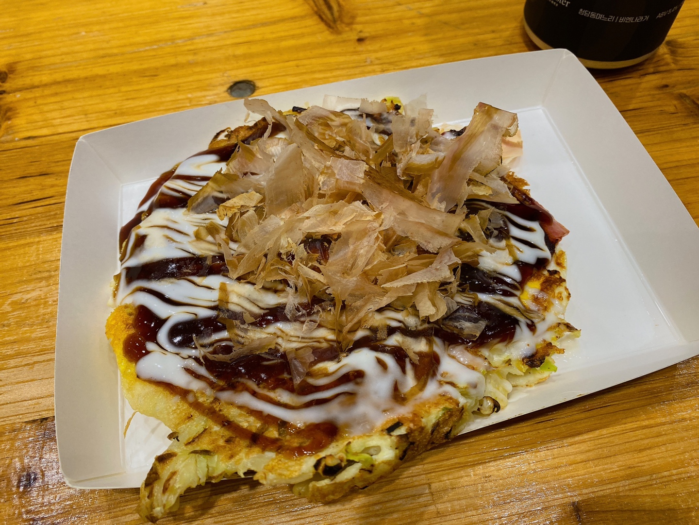 어느 정도 구경을 하다가 남편이랑 오코노미야끼(10,000원)랑 즉석 육전구이(15,000원)를 사 먹었답니다. 원래 오코노미야끼/야끼소바 세트 먹고 싶었는데 시간이 좀 걸린다고 해서 야끼소바는 포기했답니다.
