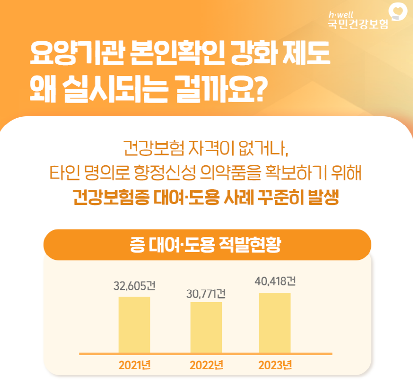 요양기관 본인확인 강화제도가 2024.5.20.부터 시행합니다. 건강보험 자격이 없거나, 타인 명의로 향정신성 의약품을 확보하기 위해 건강보험증 등을 대여·도용하는 부정수급 사례가 지속적으로 발생하고 있어, 이를 사전에 예방하기 위해 시행되는 것이라고 합니다.