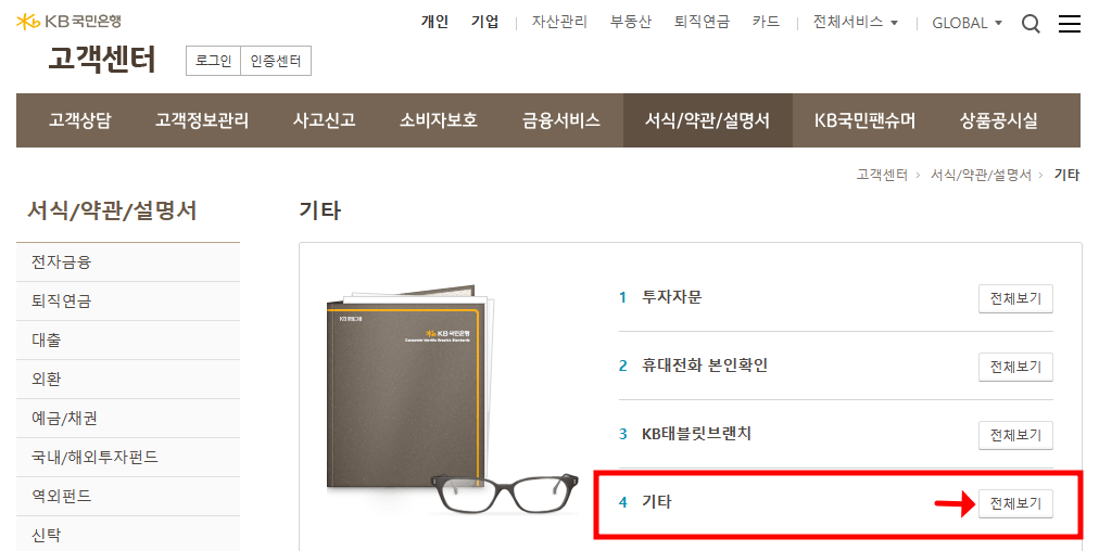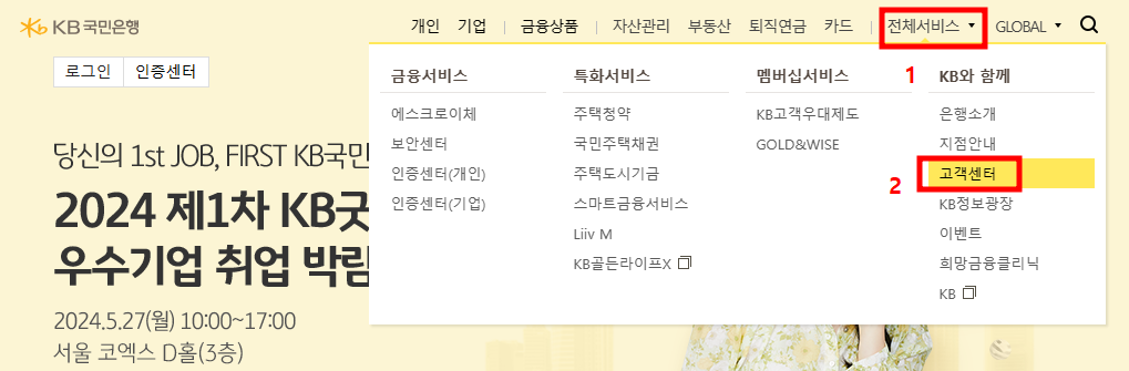 먼저 국민은행 사이트에 접속해서 우측 상단에 '전체서비스'에 마우스를 대고 밑으로 보이는 '고객센터'를 클릭해줍니다.