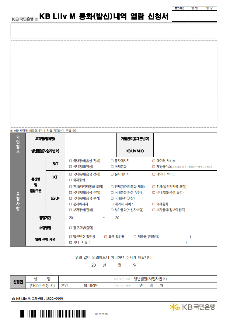 먼저 국민은행 홈페이지에서 'Liiv M통화(발신) 내역 열람 신청서'를 다운로드 받아 작성해서 신분증 사본과 함께 팩스로 신청하면 이메일로 받아볼 수 있습니다.