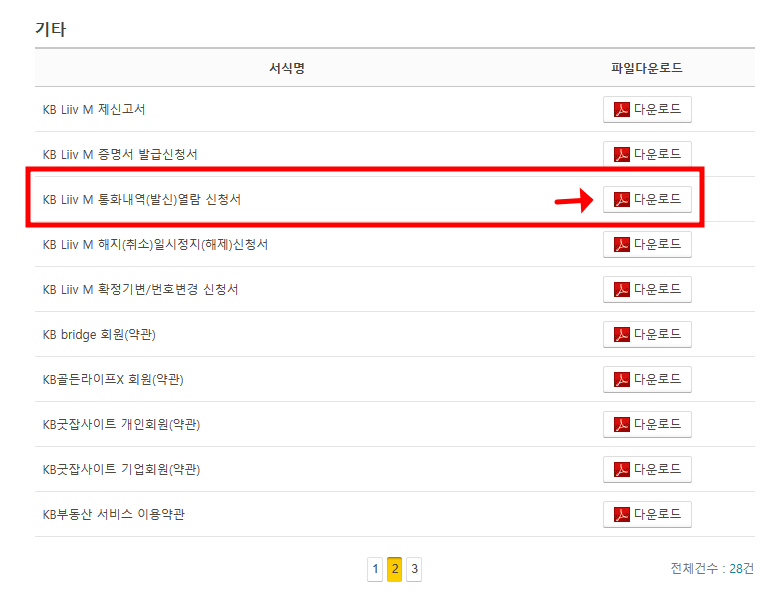 2번째 페이지에 있는 'KB Liiv M통화내역(발신) 열람 신청서' 오른쪽에 '다운로드'를 클릭해 줍니다.